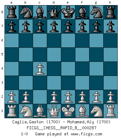 Last move : 1-0 2018 August 7 21:53:26 [Event "FICGS__CHESS__RAPID_B__000287"] [Site "FICGS"] [Date "2018.07.08"] [Round "1"] [White "Caglia,Gaston"] [Black "Mohamed,Aly"] [Result "1-0"] [WhiteElo "1700"] [BlackElo "1700"] 1.c4 1-0 This chess game has been lost on time (started : 2018.07.08 11:17:2) English Opening Player White won this chess game. Follow this game move after move (download)What is the object of playing a gambit opening?... To acquire a reputation of being a dashing player at the cost of losing a game. (Siegbert Tarrasch) Im Spitzenschach von heute geht es nur um Vorbereitung, um tiefgründige, sorgfältige Eröffnungsvorbereitung. (Nigel Short) Los Peones son nacidos libres, y aún así, se encuentran por doquier encadenados. (Rick Kennedy) Les pièces de l'échiquier étaient impitoyables. Elles le retenaient, elles l'absorbaient. Il y avait de l'horreur en cela, mais aussi une harmonie unique. Car, qu'y a-t-il dans le monde, à part les échecs ? (V. Nabokov) You have to believe in yourself. (Sun Tzu)