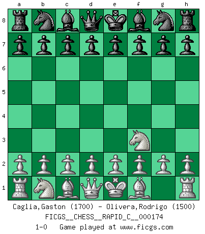 Last move : 1-0 2018 August 7 21:53:26 [Event "FICGS__CHESS__RAPID_C__000174"] [Site "FICGS"] [Date "2018.07.08"] [Round "1"] [White "Caglia,Gaston"] [Black "Olivera,Rodrigo"] [Result "1-0"] [WhiteElo "1700"] [BlackElo "1500"] 1.Nf3 1-0 This chess game has been lost on time (started : 2018.07.08 19:27:8) Reti Opening Player White won this chess game. Follow this game move after move (download)Openings teach you openings. Endgames teach you chess ! (Stephan Gerzadowicz) Es hat in meinem Leben Zeiten gegeben, in denen das Schachspiel, wenn nicht zum Lebenszweck, so doch zu einem regelrechten Lebensersatz geworden ist. Man fühlt sich in solchen Zeiten nicht so, als besäße man eine göttliche Gabe, sondern eher so, als sei man von ihr besessen. (Garry Kasparov) El tablero es el mundo, las piezas es el fenomeno del universo, las reglas del juego son lo que llamamos leyes de la naturaleza y el jugador del lado opuesto, se encuentra oculto a nuestra vista. (Thomas Huxley) Si rien de grave n'est détecté lors de l'analyse d'une position, on joue alors le coup. Seconde règle de Blumenfeld. Sometimes it pays to stay in bed in Monday, rather than spending the rest of the week debugging Monday's code. (Dan Salomon)