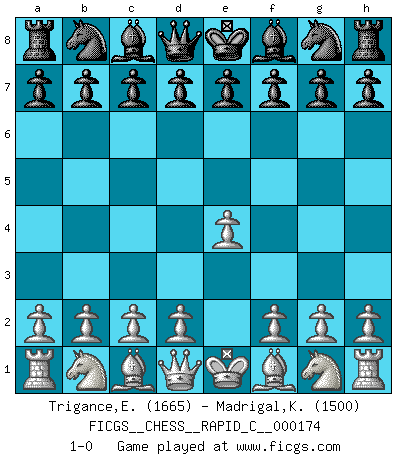 Last move : 1-0 2018 August 7 21:53:26 [Event "FICGS__CHESS__RAPID_C__000174"] [Site "FICGS"] [Date "2018.07.08"] [Round "1"] [White "Trigance,Emile"] [Black "Madrigal,Kristine"] [Result "1-0"] [WhiteElo "1665"] [BlackElo "1500"] 1.e4 1-0 This chess game has been lost on time (started : 2018.07.08 19:27:8) King's pawn Opening Player White won this chess game. Follow this game move after move (download)I look one move ahead... the best ! (Siegbert Tarrasch) Ich glaube nicht an Psychologie, ich glaube an gute Züge. (Robert James Fischer) Los asuntos humanos son como una partida de Ajedrez: solo aquellos que no lo toman seriamente, pueden ser llamados buenos jugadores. (Hung Tzu Ch'eng) La menace est plus forte que l'exécution. (Aaron Nimzovitch) Establishing goals is all right if you don't let them deprive you of interesting detours. (Doug Larson)