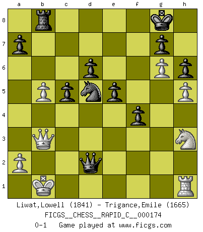 Last move : 0-1 2018 July 16 11:37:29 [Event "FICGS__CHESS__RAPID_C__000174"] [Site "FICGS"] [Date "2018.07.08"] [Round "1"] [White "Liwat,Lowell"] [Black "Trigance,Emile"] [Result "0-1"] [WhiteElo "1841"] [BlackElo "1665"] 1.d4 Nf6 2.c4 e6 3.Nc3 Bb4 4.f3 c5 5.d5 Bxc3+ 6.bxc3 Qa5 7.Bb2 d6 8.e4 O-O 9.g4 e5 10.h4 Qd8 11.h5 Bd7 12.g5 Ne8 13.Bc1 f6 14.g6 h6 15.Bh3 f5 16.Bg2 Qf6 17.Be3 f4 18.Bf2 Qg5 19.Bh3 Nf6 20.Qb3 b6 21.Bxd7 Nbxd7 22.Qb5 Rad8 23.O-O-O Qg2 24.Nh3 Qxf3 25.Kb2 Nxe4 26.Bh4 Qxc3+ 27.Kb1 Nd2+ 28.Rxd2 Qxd2 29.Bxd8 Rxd8 30.Qb3 Nf6 31.Qf3 b5 32.cxb5 Rb8 33.Qb3 Nxd5 0-1 Nimzo-Indian : Kmoch variation Kingside Castling by player Black (move 8) Queenside Castling by player White (move 23) Player Black won this chess game. Follow this game move after move (download)One of these modest little moves may be more embarrassing to your opponent than the biggest threat. (Siegbert Tarrasch) Wenn ich einen Club besuche, sind die Spieler stumm vor Staunen. (José Raúl Capablanca) Algunos sacrificios son sólidos, los demás son míos. (Mikhail Tal) On a dit que l'homme se distingue de l'animal par le fait qu'il achète plus de livres qu'il ne peut en lire. Je voudrais suggérer qu'inclure à la liste des livres quelques livres d'échecs rendrait la distinction manifeste. (Edward Lasker) Indecision is the key to flexibility. (Unknown)