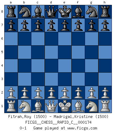 Last move : 0-1 2018 August 7 21:53:26 [Event "FICGS__CHESS__RAPID_C__000174"] [Site "FICGS"] [Date "2018.07.08"] [Round "1"] [White "Fitrah,Roy"] [Black "Madrigal,Kristine"] [Result "0-1"] [WhiteElo "1500"] [BlackElo "1500"] 0-1 This chess game has been lost on time (started : 2018.07.08 19:27:8) Player Black won this chess game. Follow this game move after move (download)War is the child of passion, passion is the child of narcissism and narcissism is the child. (...) Another game ? (Thibault de Vassal) Die Elozahlen sind sehr schlecht für das Schach. Jetzt ist Schach eine Sportindustrie, die darauf zielt Elopunkte zu machen. (Miguel Najdorf) Debemos de asegurarnos de que el Ajedrez no se convierta en un lenguaje muerto, muy interesante, pero solo para un grupo muy pequeño. (Sytze Faber) L'attaque fait le spectacle, la défense gagne les matchs. (Dicton footballistique) Hold em is to stud what chess is to checkers. (Johnny Moss)