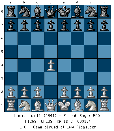Last move : 1-0 2018 August 8 9:52:43 [Event "FICGS__CHESS__RAPID_C__000174"] [Site "FICGS"] [Date "2018.07.08"] [Round "1"] [White "Liwat,Lowell"] [Black "Fitrah,Roy"] [Result "1-0"] [WhiteElo "1841"] [BlackElo "1500"] 1.d4 1-0 This chess game has been lost on time (started : 2018.07.08 19:27:8) Queen's pawn Player White won this chess game. Follow this game move after move (download)Chess is a fairy tale of 1001 blunders. (Savielly Tartakower) Im Reiche der Wirklichkeit ist man nie so glücklich wie im Reiche der Gedanken. (Arthur Schopenhauer) Todo lo que importa ante el tablero de Ajedrez son buenas jugadas. (Bobby Fischer) Le thème de l'attaque double intervient d'une manière ou d'une autre dans l'immense majorité des combinaisons. (Youri Averbakh) Experience is the name we all give to our mistakes. (Oscar Wilde)
