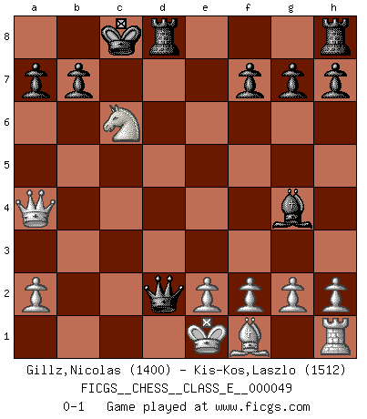 Last move : 0-1 2007 May 31 0:20:39 [Event "FICGS__CHESS__CLASS_E__000049"] [Site "FICGS"] [Date "2007.05.14"] [Round "1"] [White "Gillz,Nicolas"] [Black "Kis-Kos,Laszlo"] [Result "0-1"] [WhiteElo "1400"] [BlackElo "1512"] 1.d4 Nf6 2.c4 c5 3.Nc3 cxd4 4.Qxd4 Nc6 5.Qd1 e6 6.Nf3 d5 7.cxd5 exd5 8.Bg5 d4 9.Ne4 Be7 10.Nxf6+ Bxf6 11.Bxf6 Qxf6 12.b4 Nxb4 13.Qa4+ Nc6 14.Rd1 Bg4 15.Nxd4 O-O-O 16.Nxc6 Qc3+ 17.Rd2 Qxd2+ 0-1 Benoni defense Queenside Castling by player Black (move 15) Player Black won this chess game. Follow this game move after move (download)The passion for playing Chess is one of the most unaccountable in the world. (H.G. Wells) Bis zum Jahr 1971 verlief in meiner Schachkariere alles glatt. Dieses dramatische Match [Fischer-Taimanov 6:0] machte mein Leben zur Hölle. (Mark Taimanov) Hasta este punto, las blancas han seguido un análisis bien conocido. Pero ahora el hace un error fatal: empieza a usar su propia cabeza. (Siegbert Tarrasch) Le thème de l'attaque double intervient d'une manière ou d'une autre dans l'immense majorité des combinaisons. (Youri Averbakh) When you stop learning you start dying. (M. Scott Adams)