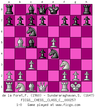 Last move : 1-0 2018 September 1 23:30:57 [Event "FICGS__CHESS__CLASS_C__000257"] [Site "FICGS"] [Date "2018.07.08"] [Round "1"] [White "de la Foret,Fred"] [Black "Sundararaghavan,Shailesh"] [Result "1-0"] [WhiteElo "1960"] [BlackElo "1647"] 1.e4 e5 2.Nf3 Nc6 3.Bb5 Bc5 4.c3 Nf6 5.d4 exd4 6.e5 Ne4 7.O-O 1-0 This chess game has been lost on time (started : 2018.07.08 19:28:12) Ruy Lopez : Classical defense, 4.c3 Kingside Castling by player White (move 7) Player White won this chess game. Follow this game move after move (download)No price is too great for the scalp of the enemy King. (Koblentz) Fallen sollten polizeilich verboten werden. (Savielly Grigorievitsch Tartakower) El Ajedrez es un juego de pelea el cual es puramente intelectual e incluye la suerte. (Richard Reti) La vérité est comme le meilleur coup aux échecs : elle existe, mais il faut la chercher. (Arturo Perez-Reverte) When you stop learning you start dying. (Scott Adams)