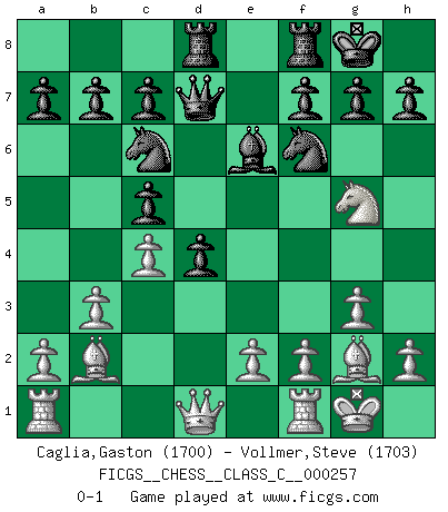 Last move : 0-1 2018 October 4 18:51:24 [Event "FICGS__CHESS__CLASS_C__000257"] [Site "FICGS"] [Date "2018.07.08"] [Round "1"] [White "Caglia,Gaston"] [Black "Vollmer,Steve"] [Result "0-1"] [WhiteElo "1700"] [BlackElo "1703"] 1.c4 e5 2.Nc3 Nf6 3.Nf3 Nc6 4.g3 Bc5 5.Bg2 O-O 6.O-O d6 7.d4 exd4 8.Na4 Be6 9.Nxc5 dxc5 10.b3 Qe7 11.Bb2 Rad8 12.Ng5 Qd7 0-1 This chess game has been lost on time (started : 2018.07.08 19:28:12) English Opening Kingside Castling by player Black (move 5) Kingside Castling by player White (move 6) Player Black won this chess game. Follow this game move after move (download)When you see a good move, look for a better one. (Emanuel Lasker) Du musst Deinen Gegner in einen tiefen dunklen Wald führen wo 2+2=5 ist und wo der Weg, der wieder hinausführt, nur breit genug für einen ist. (Mikhail Nekhemyevich Tal) Yo jugué Ajedrez con el y a veces le pude haber ganado solo que siempre devuelve su última jugada y juega la partida de manera diferente. (Mark Twain) Avant la finale, les dieux ont créé le milieu de partie. (Tarrasch) Heh, heh, heh. Time to abandon ship. (General Grievous in Star Wars ep.3)