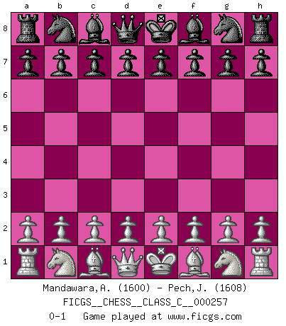 Last move : 0-1 2018 August 17 22:46:54 [Event "FICGS__CHESS__CLASS_C__000257"] [Site "FICGS"] [Date "2018.07.08"] [Round "1"] [White "Mandawara,Abhishek"] [Black "Pech,Jaroslav senior"] [Result "0-1"] [WhiteElo "1600"] [BlackElo "1608"] 0-1 This chess game has been lost on time (started : 2018.07.08 19:28:12) Player Black won this chess game. Follow this game move after move (download)A bad plan is better than none at all. (Frank Marshall) Schach ist wie eine schöne Frau, zu der wir ständig zurückkehren, gleichviel, wie oft sie uns zurückweist. (Anonymous) El arma más poderosa en el Ajedrez, es tener la próxima movida. (David Bronstein) 'L'échange des dames est un coup dur pour les deux adversaires...' Un journaliste lors d'une partie du match Spassky-Fischer Begin at the beginning and go on till you come to the end; then stop. (Lewis Carrol, Alice in Wonderland)
