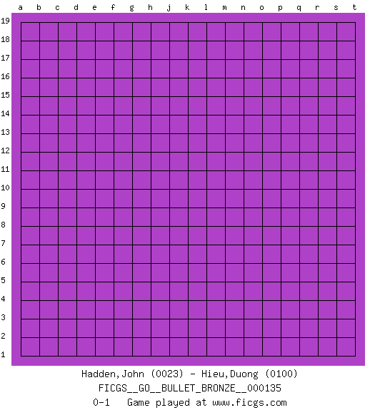 Last move : 0-1 2018 July 9 7:5:1 [Event "FICGS__GO__BULLET_BRONZE__000135"] [Site "FICGS"] [Date "2018.07.09"] [Round "1"] [Black "Hadden,John"] [White "Hieu,Duong"] [Result "0-1"] [Rating 1 "0023"] [Rating 2 "0100"] 0-1 This go game has been lost on time (started : 2018.07.09 2:54:10) Here are the names of the openings (joseki) played in the four corners : Player White won this Go (weiqi, baduk) game. Follow this game move after move (download)Corner, side, centre. (Anonymous) Good luck. You're gonna need it. (Han Solo in Star Wars ep.6)