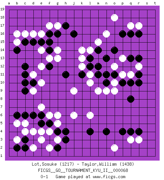 Last move : 0-1 2018 October 3 16:42:59 [Event "FICGS__GO__TOURNAMENT_KYU_II__000068"] [Site "FICGS"] [Date "2018.07.10"] [Round "1"] [Black "Lot,Sosuke"] [White "Taylor,William"] [Result "0-1"] [Rating 1 "1217"] [Rating 2 "1438"] 1.q16 d16 2.q4 d4 3.f3 r17 4.r16 q17 5.p16 o18 6.q10 r3 7.r4 q3 8.p4 o2 9.c6 f4 10.g4 e3 11.f5 e4 12.e6 c5 13.b6 g3 14.h3 f2 15.g2 g5 16.h4 f6 17.e5 e7 18.d6 g6 19.c9 j6 20.l4 b5 21.c12 l6 22.n4 d11 23.c11 d9 24.d10 e10 25.c10 m9 26.m11 o9 27.n10 n9 28.q8 p11 29.p10 o10 30.o11 o12 31.n11 q11 32.r11 r12 33.r10 p13 34.r13 m13 35.k11 k13 36.h11 j9 37.f12 n16 38.q13 f17 39.g16 g17 40.j16 l11 41.l12 l10 42.m12 k12 43.l13 l14 44.m14 k14 45.n13 m15 46.o14 g14 47.f16 e16 48.f14 g13 49.h17 f13 50.e15 e14 51.d15 c16 52.f15 e12 53.c3 d2 54.c2 b3 55.b2 c4 56.c15 b15 57.b14 b16 0-1 Here are the names of the openings (joseki) played in the four corners : Corner d4 : d4 f3 Hoshi (Hwajeom, Seongjeom, Xingwei`) 4-4 Point. The star or hoshi (4-4) point, emphasizing influence at the potential expense of territory. Ikken Kakari (Hankan Keolch'im, Yi Gua`jiao~, 1-Space Low Approach). Black 2 is the standard approach move to the 4-4. Corner q16 : q16 r17 Hoshi (Hwajeom, Seongjeom, Xingwei`) 4-4 Point. The star or hoshi (4-4) point, emphasizing influence at the potential expense of territory. Corner q4 : q4 r3 Hoshi (Hwajeom, Seongjeom, Xingwei`) 4-4 Point. The star or hoshi (4-4) point, emphasizing influence at the potential expense of territory. Corner d16 : d16 c12 Hoshi (Hwajeom, Seongjeom, Xingwei`) 4-4 Point. The star or hoshi (4-4) point, emphasizing influence at the potential expense of territory. Player White won this Go (weiqi, baduk) game. Follow this game move after move (download)Everything would seem to be possible in Go. Like pulling a rabbit, by a magical move, out of a hat. (Pierre Audouard) Mac users swear by their computers. PC users swear at their computers. (Author unknown)