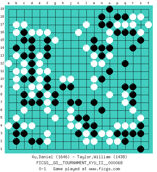 Last move : 0-1 2019 January 19 3:4:45 [Event "FICGS__GO__TOURNAMENT_KYU_II__000068"] [Site "FICGS"] [Date "2018.07.10"] [Round "1"] [Black "Xu,Daniel"] [White "Taylor,William"] [Result "0-1"] [Rating 1 "1646"] [Rating 2 "1438"] 1.q16 c4 2.q3 d16 3.r9 r17 4.r16 q17 5.o17 p17 6.p16 o18 7.s17 s18 8.n18 o16 9.n17 s16 10.s15 t17 11.r14 o15 12.m15 l17 13.p18 o13 14.q12 k16 15.q18 r18 16.o19 l14 17.m14 m13 18.n13 n12 19.n14 m12 20.o14 q4 21.p3 r4 22.r3 q8 23.r8 q7 24.r7 r6 25.q9 o8 26.d14 f16 27.c16 c17 28.c15 b17 29.c10 f3 30.c7 n3 31.s4 s5 32.s3 p4 33.o11 o3 34.n10 p2 35.q2 o2 36.s1 g5 37.m7 m9 38.j7 j5 39.k5 k4 40.l5 j6 41.k7 m10 42.g7 h10 43.l4 l3 44.k3 j4 45.m3 l2 46.m4 m2 47.c3 d4 48.b4 b5 49.b2 a4 50.b3 c6 51.e2 f2 52.d2 e9 53.f9 e10 54.e8 d8 55.d7 f8 56.e7 f7 57.g8 f6 58.f10 e11 59.j9 j10 60.h9 f11 61.n6 c12 62.b12 b13 63.c13 b11 64.d12 c11 65.b14 a12 66.d11 b10 67.d10 e13 68.d13 b9 69.c8 d9 70.d15 e16 71.f13 e12 72.f15 g15 73.f14 b16 0-1 Here are the names of the openings (joseki) played in the four corners : Corner q16 : q16 r17 Hoshi (Hwajeom, Seongjeom, Xingwei`) 4-4 Point. The star or hoshi (4-4) point, emphasizing influence at the potential expense of territory. Corner d16 : d16 d14 Hoshi (Hwajeom, Seongjeom, Xingwei`) 4-4 Point. The star or hoshi (4-4) point, emphasizing influence at the potential expense of territory. Ikken Takagakari (Hankan Nop'dakeolch'im, Yi Gaojia, 1-Space High Approach). White typically responds at 6-4 or 3-10. White 4-10 is played when White finds play on the right side advantageous. White 4-8 or 3-8 may be played when White has support at top. Player White won this Go (weiqi, baduk) game. Follow this game move after move (download)Don't make dango's. (Anonymous) The problem with troubleshooting is that trouble shoots back. (Anonymous)