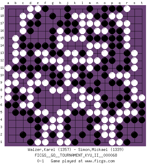 Last move : 0-1 2019 February 22 21:45:57 [Event "FICGS__GO__TOURNAMENT_KYU_II__000068"] [Site "FICGS"] [Date "2018.07.10"] [Round "1"] [Black "Walzer,Karel"] [White "Simon,Mickael"] [Result "0-1"] [Rating 1 "1357"] [Rating 2 "1339"] 1.d4 q17 2.q3 q5 3.d16 r15 4.q7 o5 5.n4 p3 6.r4 q4 7.q2 r5 8.s4 p2 9.s2 c6 10.c5 d6 11.f4 c10 12.c12 e10 13.k16 h4 14.j3 h3 15.j4 h5 16.g2 h2 17.j2 j1 18.k1 h1 19.l2 c17 20.d17 c16 21.c15 b15 22.c14 b14 23.o17 c13 24.d13 b13 25.e12 q10 26.o7 n5 27.m4 n7 28.s6 r6 29.r7 s5 30.q9 r9 31.p9 p10 32.n9 l6 33.k7 j5 34.k5 k6 35.l5 m5 36.n2 l8 37.l9 k8 38.q16 r16 39.p16 m17 40.m16 l17 41.k17 l16 42.g16 l15 43.p17 q18 44.n13 n16 45.p14 q13 46.p13 q12 47.l13 k15 48.j16 k13 49.h13 j13 50.h10 k10 51.k9 j9 52.l10 j10 53.g11 d18 54.e18 c18 55.e17 h14 56.g14 h15 57.g15 h16 58.h17 h12 59.g13 l12 60.m12 m11 61.l11 k12 62.n11 f3 63.e3 f2 64.e2 e1 65.d1 f1 66.c2 g3 67.e8 f9 68.e6 e5 69.d5 f5 70.e4 e19 71.f19 d19 72.g18 k18 73.j18 l18 74.m15 m14 75.n15 m13 76.m10 n14 77.o15 o13 78.o12 n12 79.p12 m11 80.o11 m12 81.b11 b10 82.b6 c8 83.c7 d7 84.b7 d8 85.b8 b9 86.j8 h8 87.m8 l7 88.n8 m7 89.r8 s9 90.p6 o4 91.p5 p4 92.t5 s7 93.t6 s8 94.o10 g12 95.f11 f12 96.e11 f13 97.f14 j15 98.j17 g4 99.h9 h11 100.k11 j11 101.g9 g8 102.g10 n3 103.m3 b12 104.c11 a11 105.d10 e9 106.n18 n17 107.q14 r14 108.d11 d9 109.o6 p18 110.o18 e13 111.e14 j7 112.d14 a8 113.b5 o14 114.q15 o16 115.p15 t7 116.t4 o2 117.n1 n6 118.q6 a7 119.a6 a9 120.r11 r10 121.q11 s11 122.r13 s12 123.r12 s13 124.p19 r17 125.q19 r19 126.o19 q1 127.r1 p1 128.m19 m18 129.j19 o3 0-1 Here are the names of the openings (joseki) played in the four corners : Corner q4 : q3 q5 Komoku (Somok, Xiao~mu`) 3-4 Point. The komoku (3-4) point is the traditional corner enclosure move.. Ikken Takagakari (Hankan Nop'dakeolch'im, Yi Gaogua`jiao~, 1-Space High Approach). The 5-4 approach move has become more popular in modern times, as modern Go emphasizes speed and influence. Corner d4 : d4 c6 Hoshi (Hwajeom, Seongjeom, Xingwei`) 4-4 Point. The star or hoshi (4-4) point, emphasizing influence at the potential expense of territory. Ikken Kakari (Hankan Keolch'im, Yi Gua`jiao~, 1-Space Low Approach). White 2 is the standard approach move to the 4-4. Player White won this Go (weiqi, baduk) game. Follow this game move after move (download)Proverbs do not apply to White. (Tero Sand) Either move or be moved. (Ezra Pound)