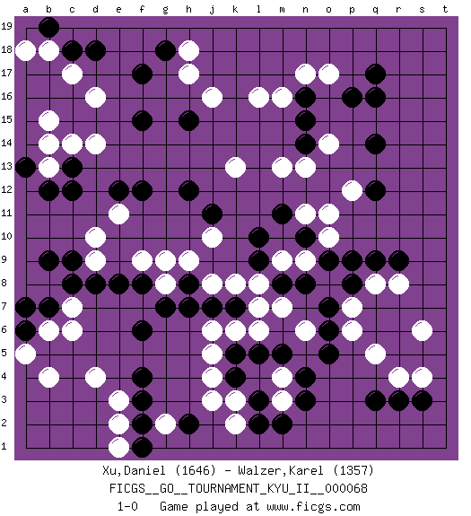 Last move : 1-0 2018 November 22 18:14:14 [Event "FICGS__GO__TOURNAMENT_KYU_II__000068"] [Site "FICGS"] [Date "2018.07.10"] [Round "1"] [Black "Xu,Daniel"] [White "Walzer,Karel"] [Result "1-0"] [Rating 1 "1646"] [Rating 2 "1357"] 1.q16 d4 2.q3 d16 3.r9 q5 4.n3 d10 5.f17 h17 6.f15 d14 7.d18 c17 8.c18 o17 9.q14 l16 10.h15 j16 11.c12 b13 12.b12 b15 13.c13 c14 14.e12 j3 15.a13 b18 16.b19 a18 17.c9 d9 18.c8 c6 19.d8 e11 20.f12 f9 21.e8 j10 22.f3 e3 23.f4 m3 24.n4 r4 25.r3 r8 26.q9 q8 27.p9 s6 28.s3 s4 29.m2 m4 30.l2 j6 31.f6 p12 32.q12 o14 33.q17 k13 34.h12 n9 35.p8 n6 36.n8 m9 37.m8 l8 38.o6 p6 39.o5 p7 40.o7 m7 41.l9 k8 42.l10 n11 43.m11 o11 44.n10 o10 45.o9 g2 46.f2 e2 47.f1 e1 48.h8 g8 49.g7 h9 50.f8 g9 51.h7 j8 52.n15 m13 53.n16 n17 54.n14 n13 55.p16 m16 56.b7 b6 57.a6 a5 58.a7 b4 59.k4 k3 60.l3 j4 61.k5 j5 62.m5 l6 63.l5 k6 64.j11 c7 65.b9 b14 66.g18 h18 67.j7 k2 68.k7 l7 69.h2 1-0 Here are the names of the openings (joseki) played in the four corners : Corner d16 : d16 f17 Hoshi (Hwajeom, Seongjeom, Xingwei`) 4-4 Point. The star or hoshi (4-4) point, emphasizing influence at the potential expense of territory. Ikken Kakari (Hankan Keolch'im, Yi Gua`jiao~, 1-Space Low Approach). Black 2 is the standard approach move to the 4-4. Corner q16 : q16 o17 Hoshi (Hwajeom, Seongjeom, Xingwei`) 4-4 Point. The star or hoshi (4-4) point, emphasizing influence at the potential expense of territory. Ikken Kakari (Hankan Keolch'im, Yi Gua`jiao~, 1-Space Low Approach). White 2 is the standard approach move to the 4-4. Player Black won this Go (weiqi, baduk) game. Follow this game move after move (download)The intersection is rarely neutral. (Pierre Audouard) Man is still the most extraordinary computer of all. (John F. Kennedy)