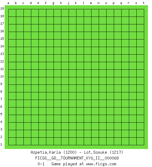 Last move : 0-1 2018 August 9 21:57:8 [Event "FICGS__GO__TOURNAMENT_KYU_II__000068"] [Site "FICGS"] [Date "2018.07.10"] [Round "1"] [Black "Azpetia,Karla"] [White "Lot,Sosuke"] [Result "0-1"] [Rating 1 "1200"] [Rating 2 "1217"] 0-1 This go game has been lost on time (started : 2018.07.10 11:23:15) Here are the names of the openings (joseki) played in the four corners : Player White won this Go (weiqi, baduk) game. Follow this game move after move (download)A few moments to learn, a lifetime to master. (Ancient proverb) If passion drives you, let reason holds the reins. (Benjamin Franklin)