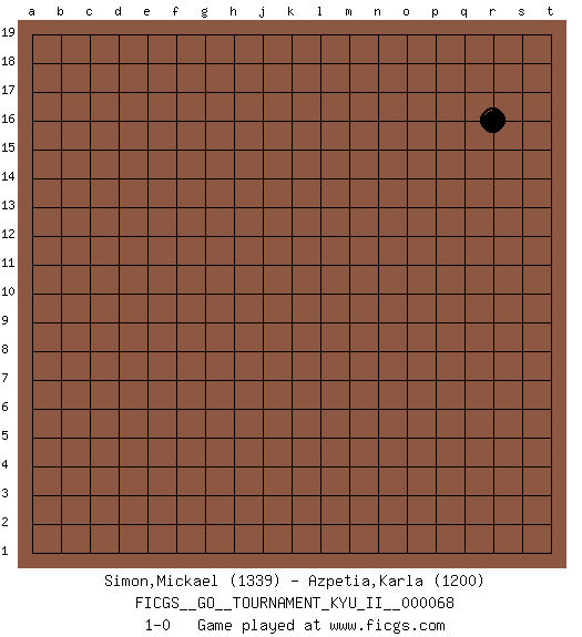 Last move : 1-0 2018 August 11 10:3:55 [Event "FICGS__GO__TOURNAMENT_KYU_II__000068"] [Site "FICGS"] [Date "2018.07.10"] [Round "1"] [Black "Simon,Mickael"] [White "Azpetia,Karla"] [Result "1-0"] [Rating 1 "1339"] [Rating 2 "1200"] 1.r16 1-0 This go game has been lost on time (started : 2018.07.10 11:23:15) Here are the names of the openings (joseki) played in the four corners : Player Black won this Go (weiqi, baduk) game. Follow this game move after move (download)Big groups never die. (Anonymous) Memory is a way of holding onto the things you love, the things you are, the things you never want to lose. (from the television show: The Wonder Years)