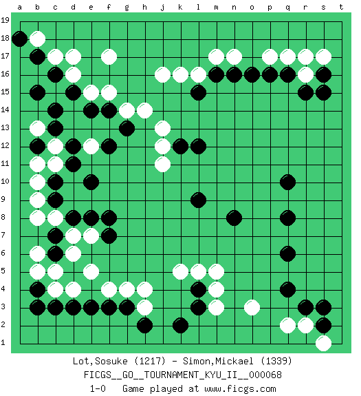 Last move : 1-0 2018 October 7 22:13:6 [Event "FICGS__GO__TOURNAMENT_KYU_II__000068 "] [Site "FICGS"] [Date "2018.07.10"] [Round "1"] [Black "Lot,Sosuke "] [White "Simon,Mickael "] [Result "1-0"] [Rating 1 "1217"] [Rating 2 "1339"] 1.r15 d4 2.q4 q17 3.p16 p17 4.o16 n17 5.q10 d16 6.n16 m17 7.f3 o3 8.l4 m5 9.q6 m4 10.l3 q2 11.r3 m3 12.c6 e5 13.c3 d7 14.d3 g4 15.g3 h4 16.k2 l5 17.c14 f17 18.c16 c17 19.b17 d17 20.b15 j16 21.m16 l16 22.l15 k16 23.q8 c4 24.b4 b5 25.b3 b6 26.l9 r16 27.s16 s17 28.q16 r17 29.s15 r2 30.s2 s1 31.s3 c12 32.d15 e15 33.e14 f15 34.n8 e12 35.c7 c5 36.c10 c8 37.e10 j12 38.l12 k5 39.b12 b13 40.c13 b11 41.d12 c11 42.d11 b10 43.k12 h3 44.h2 b18 45.a18 j11 46.c9 b9 47.d8 b8 48.e8 e7 49.f7 d6 50.f8 f4 51.e3 j13 52.f14 g14 53.g13 h14 54.f12 1-0 Here are the names of the openings (joseki) played in the four corners : Corner q16 : r15 q17Mokuhazushi (Waemok, Wai`mu`) 5-3 Point. The mokuhazushi (5-3) point was popular in the Edo period in Japan (1600 - 1867). It emphasizes influence; territorially, it is inferior to the 3-4 point.Komoku Kakari. White 2 is the standard approach because of its solidity and stability. Corner d4 : d4 f3Hoshi (Hwajeom, Seongjeom, Xingwei`) 4-4 Point. The star or hoshi (4-4) point, emphasizing influence at the potential expense of territory.Ikken Kakari (Hankan Keolch'im, Yi Gua`jiao~, 1-Space Low Approach). Black 2 is the standard approach move to the 4-4. Corner q4 : q4 o3Hoshi (Hwajeom, Seongjeom, Xingwei`) 4-4 Point. The star or hoshi (4-4) point, emphasizing influence at the potential expense of territory.Ikken Kakari (Hankan Keolch'im, Yi Gua`jiao~, 1-Space Low Approach). White 2 is the standard approach move to the 4-4. Corner d16 : d16 c14Hoshi (Hwajeom, Seongjeom, Xingwei`) 4-4 Point. The star or hoshi (4-4) point, emphasizing influence at the potential expense of territory.Ikken Kakari (Hankan Keolch'im, Yi Gua`jiao~, 1-Space Low Approach). Black 2 is the standard approach move to the 4-4. Player Black won this Go (weiqi, baduk) game.Follow this game move after move (download ) If your stone is capped, play the knight's move. (Anonymous) Those who make the worst use of their time are the first to complain of its brevity. (Jean de la Bruyere)