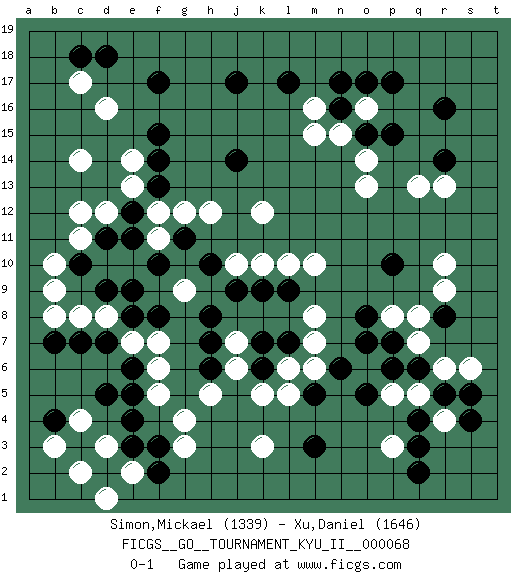 Last move : 0-1 2018 December 21 22:36:50 [Event "FICGS__GO__TOURNAMENT_KYU_II__000068"] [Site "FICGS"] [Date "2018.07.10"] [Round "1"] [Black "Simon,Mickael"] [White "Xu,Daniel"] [Result "0-1"] [Rating 1 "1339"] [Rating 2 "1646"] 1.r16 d16 2.q3 d3 3.p17 r10 4.r5 k3 5.d5 d8 6.f17 c14 7.d18 c17 8.j17 r13 9.e3 e2 10.e4 c2 11.f2 d1 12.b4 b3 13.f15 o16 14.o17 m16 15.n16 n15 16.n17 m15 17.l17 g3 18.f3 g4 19.m3 k5 20.m5 f6 21.c7 c8 22.b7 b8 23.d7 e7 24.e6 f5 25.e5 c4 26.e8 f7 27.e9 c11 28.e11 d12 29.e12 e13 30.f13 e14 31.f14 g12 32.c10 b10 33.h10 f12 34.d9 b9 35.g11 h12 36.r8 p5 37.c18 j10 38.d11 c12 39.j14 k12 40.j9 k10 41.k9 l10 42.l9 m10 43.l7 p3 44.q2 r6 45.q6 r4 46.q4 q5 47.s5 s6 48.s4 q7 49.p6 o6 50.p7 m8 51.o5 m6 52.k6 l6 53.h6 j6 54.k7 l5 55.h8 j7 56.h7 h5 57.n6 m7 58.f8 g9 59.f10 f11 60.r14 q13 61.p10 o13 62.o15 o14 63.p15 p8 64.o7 q8 65.o8 r9 0-1 Here are the names of the openings (joseki) played in the four corners : Corner d4 : d3 d5 Komoku (Somok, Xiao~mu`) 3-4 Point. The komoku (3-4) point is the traditional corner enclosure move.. Ikken Takagakari (Hankan Nop'dakeolch'im, Yi Gaogua`jiao~, 1-Space High Approach). The 5-4 approach move has become more popular in modern times, as modern Go emphasizes speed and influence. Corner d16 : d16 f17 Hoshi (Hwajeom, Seongjeom, Xingwei`) 4-4 Point. The star or hoshi (4-4) point, emphasizing influence at the potential expense of territory. Ikken Kakari (Hankan Keolch'im, Yi Gua`jiao~, 1-Space Low Approach). Black 2 is the standard approach move to the 4-4. Player White won this Go (weiqi, baduk) game. Follow this game move after move (download)When in doubt, remove the enemy stones from the board. (Bill Taylor) A generalist learns less and less about more and more until he knows nothing about everything. (Author unknown)