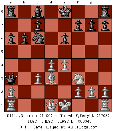 Last move : 0-1 2007 August 11 21:6:15 [Event "FICGS__CHESS__CLASS_E__000049"] [Site "FICGS"] [Date "2007.05.14"] [Round "1"] [White "Gillz,Nicolas"] [Black "Oldenhof,Dwight"] [Result "0-1"] [WhiteElo "1400"] [BlackElo "1203"] 1.d4 d5 2.c4 e6 3.Nc3 Nc6 4.Nf3 b6 5.e3 Nf6 6.cxd5 Nxd5 7.e4 Nxc3 8.bxc3 a6 9.Bg5 Be7 10.Bxe7 Qxe7 11.Bd3 Qa3 0-1 QGD : 3.Nc3 Player Black won this chess game. Follow this game move after move (download)You sit at the board and suddenly your heart leaps. Your hand trembles to pick up the piece and move it. But what Chess teaches you is that you must sit there calmly and think about whether it's really a good idea and whether there are other better ideas. (Stanley Kubrick) Charakterschwächen offenbaren sich normalerweise während einer Schachpartie. (Garry Kasparov) El Ajedrez es un cuento de Hadas de las 1001 metidas de pata. (Savielly Tartakower) Les Echecs, c'est l'art de la guerre sans les charniers, c'est la résurrection des morts tombés au champ d'honneur, l'espoir perpétuel, la suprématie de l'intelligence sur la force, la culture de l'esprit. (F. Szpiner) Industry executives and analysts often mistakenly talk about strategy as if it were some kind of chess match. But in chess, you have just two opponents, each with identical resources, and with luck playing a minimal role. The real world is much more like a poker game, with multiple players trying to make the best of whatever hand fortune has dealt them. In our industry, Bill Gates owns the table until someone proves otherwise. (David Moschella, 'Computerworld')