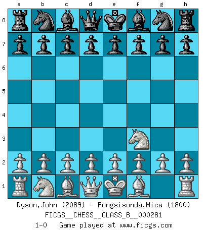 Last move : 1-0 2018 August 21 22:53:22 [Event "FICGS__CHESS__CLASS_B__000281"] [Site "FICGS"] [Date "2018.07.12"] [Round "1"] [White "Dyson,John"] [Black "Pongsisonda,Mica"] [Result "1-0"] [WhiteElo "2089"] [BlackElo "1800"] 1.Nf3 1-0 This chess game has been lost on time (started : 2018.07.12 14:20:20) Reti Opening Player White won this chess game. Follow this game move after move (download)Methodical thinking is of more use in Chess than inspiration. (C. J. S. Purdy) Die westlichen Werte sind eine Sprache, welche die Putin-Administration nicht versteht. (Garry Kasparov) En el Ajedrez, tal como en la vida, las bendiciones de hoy pueden ser el veneno del mañana. (Assaic) Vouloir jouer aux échecs contre soi-même est aussi paradoxal que vouloir marcher sur son ombre. (Stefan Zweig) It's only after you lost everything, Tyler says, that you're free to do anything. (Chuck Palahniuk, Fight Club)