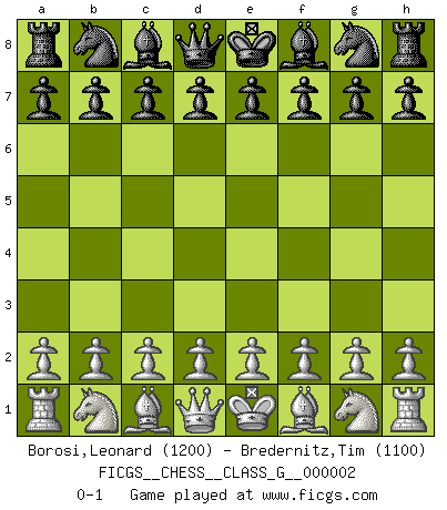 Last move : 0-1 2006 July 18 2:12:28 [Event "FICGS__CHESS__CLASS_G__000002"] [Site "FICGS"] [Date "2006.06.07"] [Round "1"] [White "Borosi,Leonard"] [Black "Bredernitz,Tim"] [Result "0-1"] [WhiteElo "1200"] [BlackElo "1100"] 0-1 This chess game has been lost on time (started : 2006.06.07 22:46:50) Player Black won this chess game. Follow this game move after move (download)Chess is a terrific way for kids to build self image and self esteem. (Saudin Robovic) Mein Name ist Rustam Kamsky. Sie haben meinen Sohn belästigt. Bereiten Sie sich aufs Sterben vor. (Rustam Kamsky) Yo siempre he tenido un ligero sentimiento de lástima por una persona que no tiene conocimiento del Ajedrez. (Siegbert Tarrasch) Des points faibles ou des trous dans la position de l'adversaire doivent être occupés par des pièces et non pas par des pions. (Siegbert Tarrasch) Memory... is the diary that we all carry with us. (Oscar Wilde, The Importance of Being Earnest)