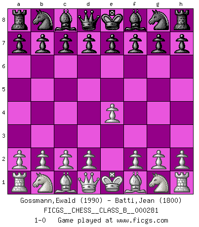 Last move : 1-0 2018 August 21 22:53:22 [Event "FICGS__CHESS__CLASS_B__000281"] [Site "FICGS"] [Date "2018.07.12"] [Round "1"] [White "Gossmann,Ewald"] [Black "Batti,Jean"] [Result "1-0"] [WhiteElo "1990"] [BlackElo "1800"] 1.e4 1-0 This chess game has been lost on time (started : 2018.07.12 14:20:20) King's pawn Opening Player White won this chess game. Follow this game move after move (download)If your opponent offers you a draw, try to work out why he thinks he's worse off. (Nigel Short) Ohne ihre Erfolge schmälern zu wollen würde ich sagen Petrosian, Spassky und Karpov verdanken ihre Siege ihren Trainern - Boleslavsky, Bondarevsky und Furman. (Mikhail Moiseyevich Botvinik) Del Ajedrez se ha dicho que la vida no es lo suficientemente larga para él, pero eso es culpa de la vida, no del Ajedrez. (William Ewart Napier) L'action d'une oeuvre littéraire se déroule sur un champ de bataille. Les masques et les types du drame moderne correspondent aux pièces du jeu d'échecs. L'intrigue correspond aux coups et aux gambits, c'est à dire aux techniques du jeu telles qu'utilisées et interprétées par les joueurs. Les tactiques et les péripéties [mouvements] correspondent aux coups exécutés par l'adversaire. (Viktor Shklovsky) The beginning is the most important part of the work. (Plato)