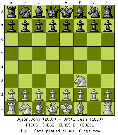 Last move : 1-0 2018 August 21 22:53:22 [Event "FICGS__CHESS__CLASS_B__000281"] [Site "FICGS"] [Date "2018.07.12"] [Round "1"] [White "Dyson,John"] [Black "Batti,Jean"] [Result "1-0"] [WhiteElo "2089"] [BlackElo "1800"] 1.Nf3 1-0 This chess game has been lost on time (started : 2018.07.12 14:20:20) Reti Opening Player White won this chess game. Follow this game move after move (download)Whoever sees no other aim in the game than that of giving checkmate to one's opponent will never become a good Chess player. (Euwe) Die Leute spielen gegen mich seit 15 Jahren unter Ihren Möglichkeiten. (Robert James Fischer) Creo que una cierta cantidad de temperamento es esperada de los genios del Ajedrez. (Ron Gross) Vous m'avez demandé de vous exposer quel est le fondement de la prière. Je ne fais que préparer les pièces du jeu sur la table... Nous sera-t-il permis d'en adopter les règles et si nous les appliquons scrupuleusement nous ne tarderons pas à faire mat le Roi divin ! Il ne pourra échapper à nos mains. (Sainte Thérèse d'Avila, Chemin de perfection) A clear conscience is usually the sign of a bad memory. (Unknown)