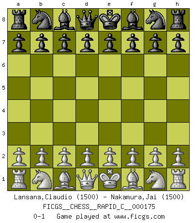 Last move : 0-1 2018 August 11 22:4:38 [Event "FICGS__CHESS__RAPID_C__000175"] [Site "FICGS"] [Date "2018.07.12"] [Round "1"] [White "Lansana,Claudio"] [Black "Nakamura,Jai"] [Result "0-1"] [WhiteElo "1500"] [BlackElo "1500"] 0-1 This chess game has been lost on time (started : 2018.07.12 17:8:24) Player Black won this chess game. Follow this game move after move (download)Some sacrifices are sound; the rest are mine. (Mikhail Tal) Ein unbeabsichtigtes Patt ist der Gipfel der Dummheit. (Anonymous) Una de estas pequeñas movidas modestas pudieran ser mas molestas a tu oponente que la amenaza mas grande. (Siegbert Tarrasch) Il a essayé de se convaincre qu'il pourrait empêcher toutes les erreurs et ne jamais perdre. L'horreur ! Gary Kasparov au sujet de Robert Fischer. Wisdom is the reward you get for a lifetime of listening when you'd have preferred to talk. (Doug Larson)