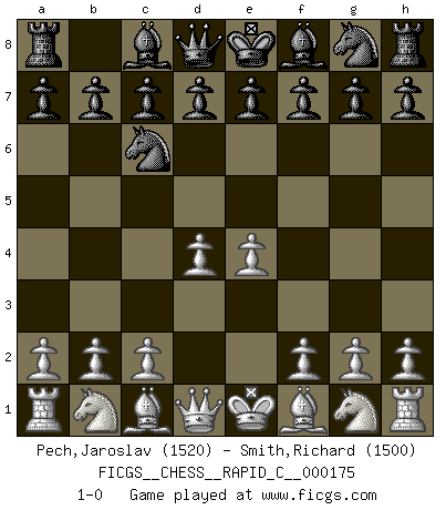 Last move : 1-0 2018 September 4 11:45:12 [Event "FICGS__CHESS__RAPID_C__000175"] [Site "FICGS"] [Date "2018.07.12"] [Round "1"] [White "Pech,Jaroslav"] [Black "Smith,Richard"] [Result "1-0"] [WhiteElo "1520"] [BlackElo "1500"] 1.e4 Nc6 2.d4 1-0 This chess game has been lost on time (started : 2018.07.12 17:8:24) KP : Nimzovich defense Player White won this chess game. Follow this game move after move (download)One bad move nullifies forty good ones. (Horowitz) Spiel ein langweiliges Spiel zu Ende und lustige Dinge können passieren. (Hans Ree) Yo nunca en mi vida he jugado la Defensa Francesa, que viene siendo la más aburrida de todas las Aperturas. (Wilhelm Steinitz) On entre au jeu d'Echecs comme on entre en Religion. Pour le joueur d'Echecs, la partie d'Echecs c'est l'office, la messe, le défilé du 1er Mai, le dépôt de gerbe au Monument aux Morts. C'est un drame sacré. (Michel Roos) Memory is a complicated thing, a relative to truth, but not its twin. (Barbara Kingsolver, Animal Dreams)