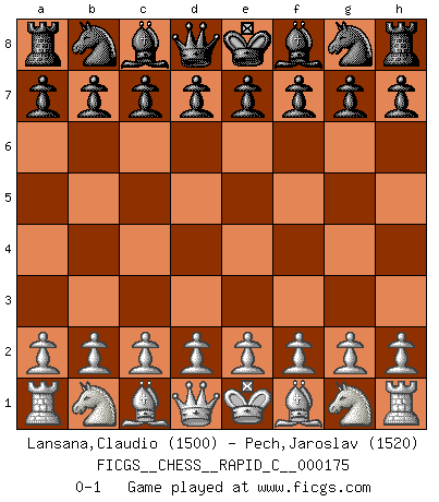 Last move : 0-1 2018 August 11 22:4:38 [Event "FICGS__CHESS__RAPID_C__000175"] [Site "FICGS"] [Date "2018.07.12"] [Round "1"] [White "Lansana,Claudio"] [Black "Pech,Jaroslav"] [Result "0-1"] [WhiteElo "1500"] [BlackElo "1520"] 0-1 This chess game has been lost on time (started : 2018.07.12 17:8:24) Player Black won this chess game. Follow this game move after move (download)Pawn endings are to Chess what putting is to golf. (Cecil Purdy) Ich kämpfe solange mein Gegner einen Fehler machen kann. (Emanuel Lasker) Puntos débiles o agujeros en la posición de tu oponente deben de ser ocupados por piezas, no Peones. (Siegbert Tarrasch) Si le désir cupide (et stupide) de gagner est une inépuisable source de souffrance, une combinaison brillante sur l'échiquier est une découverte : le coquelicot qui s'épanouit lorsque apparaît la Voie Lactée. (Arrabal) There is no vagueness without wind. (Chinese proverb)