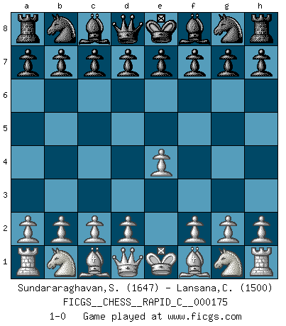 Last move : 1-0 2018 August 11 22:4:38 [Event "FICGS__CHESS__RAPID_C__000175"] [Site "FICGS"] [Date "2018.07.12"] [Round "1"] [White "Sundararaghavan,Shailesh"] [Black "Lansana,Claudio"] [Result "1-0"] [WhiteElo "1647"] [BlackElo "1500"] 1.e4 1-0 This chess game has been lost on time (started : 2018.07.12 17:8:24) King's pawn Opening Player White won this chess game. Follow this game move after move (download)The passed pawn is a criminal, who should be kept under lock and key. Mild measures, such as police surveillance, are not sufficient. (Nimzovitch) Ich habe kein Problem mit Frauen, sondern nur mit dem Niveau ihres Schachspiels (Judith Polgar) En el tablero, la mentira e hipocresía no sobreviven mucho. (Emanuel Lasker) Karpov est une pièce de musée. (Garry Kasparov) Heh, heh, heh. Time to abandon ship. (General Grievous in Star Wars ep.3)