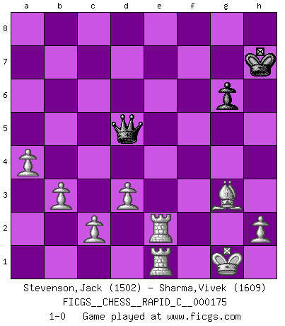 Last move : 1-0 2018 August 25 19:28:3 [Event "FICGS__CHESS__RAPID_C__000175"] [Site "FICGS"] [Date "2018.07.12"] [Round "1"] [White "Stevenson,Jack"] [Black "Sharma,Vivek"] [Result "1-0"] [WhiteElo "1502"] [BlackElo "1609"] 1.e4 e5 2.Nf3 Nc6 3.Bb5 Nd4 4.Nxd4 exd4 5.Bc4 Nf6 6.O-O d5 7.exd5 Be7 8.Qf3 O-O 9.d3 Bd7 10.a4 c6 11.Re1 Bg4 12.Qf4 Bc5 13.dxc6 Bd6 14.cxb7 Bxf4 15.Bxf4 Qb6 16.bxa8Q Rxa8 17.b3 Nh5 18.Be5 Rd8 19.Re4 Bf5 20.Bxd4 Qg6 21.Re7 Qg5 22.Re1 Bh3 23.g3 Qg4 24.Nd2 Nf4 25.Re4 Ne2+ 26.Kh1 Qh5 27.Re5 Nxg3+ 28.fxg3 Qg4 29.Rae1 h5 30.Bf2 Kh7 31.Bxf7 g6 32.Be6 Qb4 33.Bxh3 Qxd2 34.R5e2 Qg5 35.Bxa7 h4 36.Bf2 hxg3 37.Bxg3 Rd5 38.Be6 Qd8 39.Bxd5 Qxd5+ 40.Kg1 1-0 Ruy Lopez : Bird's defense Kingside Castling by player White (move 6) Kingside Castling by player Black (move 8) Promotion Queen by player White (move 16) Player White won this chess game. Follow this game move after move (download)There are two types of sacrifices: correct ones and mine. (Mikhail Tal) Das Schachspiel übertrifft alle anderen Spiele so weit wie der Chimborasso einen Misthaufen. (Arthur Schopenhauer) La táctica fluye a partir de una posición superior. (Bobby Fischer) La vie est comme un jeu d'échecs : nous esquissons un plan, mais celui-ci est tributaire de ce que daignent faire l'adversaire aux échecs et le destin dans la vie. (Arthur Schopenhauer) Life doesn't imitate art, it imitates bad television. (Woody Allen)
