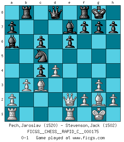 Last move : 0-1 2018 September 22 15:3:58 [Event "FICGS__CHESS__RAPID_C__000175"] [Site "FICGS"] [Date "2018.07.12"] [Round "1"] [White "Pech,Jaroslav"] [Black "Stevenson,Jack"] [Result "0-1"] [WhiteElo "1520"] [BlackElo "1502"] 1.d4 Nf6 2.c4 e6 3.Nf3 b6 4.g3 Ba6 5.b3 Bb4+ 6.Bd2 Be7 7.Bg2 c6 8.Bc3 O-O 9.O-O d5 10.Ne5 Nfd7 11.Nxd7 Nxd7 12.Nd2 Rc8 13.e4 dxe4 14.Nxe4 b5 15.Re1 bxc4 16.Qe2 Rb8 17.Nc5 Nxc5 0-1 This chess game has been lost on time (started : 2018.07.12 17:8:24) Queen's Indian : Nimzovich variation (exaggerated Fianchetto) Kingside Castling by player Black (move 8) Kingside Castling by player White (move 9) Player Black won this chess game. Follow this game move after move (download)A player surprised is half beaten. (Proverb) Kasparov ist eine Art Monster mit hundert Augen, denen auch nicht das Geringste entgeht. (Tony Miles) Una de estas pequeñas movidas modestas pudieran ser mas molestas a tu oponente que la amenaza mas grande. (Siegbert Tarrasch) Aucun coup ne doit être joué sans but. (Pedro Damiano) Somewhere in the world there is an epigram for every dilemma. (Hendrik Willem van Loon)