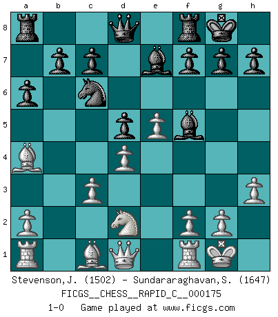 Last move : 1-0 2018 August 30 23:19:36 [Event "FICGS__CHESS__RAPID_C__000175"] [Site "FICGS"] [Date "2018.07.12"] [Round "1"] [White "Stevenson,Jack"] [Black "Sundararaghavan,Shailesh"] [Result "1-0"] [WhiteElo "1502"] [BlackElo "1647"] 1.e4 e5 2.Nf3 Nc6 3.Bb5 a6 4.Ba4 Bc5 5.O-O Nf6 6.c3 O-O 7.d4 exd4 8.cxd4 Be7 9.Nc3 d5 10.e5 Ne4 11.h3 Nxc3 12.bxc3 Bf5 13.Nd2 1-0 This chess game has been lost on time (started : 2018.07.12 17:8:24) Ruy Lopez : Classical defense deferred Kingside Castling by player White (move 5) Kingside Castling by player Black (move 6) Player White won this chess game. Follow this game move after move (download)A win by an unsound combination, however showy, fills me with artistic horror. (Wilhelm Steinitz) Es ist schade, dass viele Schachsportler vergessen, wie wichtig Auftreten und angemessene Kleidung sind. (Alexandra Kosteniuk) Después de la respuesta de las negras a 1.e4 con 1..e5, se quedan siempre tratando de entrar dentro del juego. (Howard Staunton) A ce moment-là, je menaçais de comprendre la position ! (Clément L'Heureux) For to win one hundred victories in one hundred battles is not the acme of skill. To subdue the enemy without fighting is the acme of skill. (Sun Tzu)