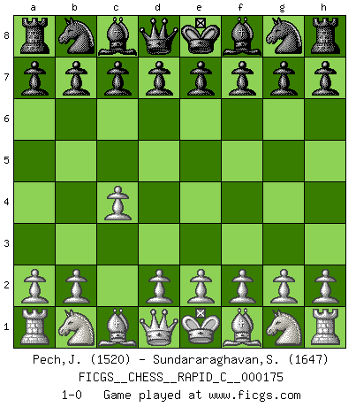 Last move : 1-0 2018 August 25 10:55:13 [Event "FICGS__CHESS__RAPID_C__000175"] [Site "FICGS"] [Date "2018.07.12"] [Round "1"] [White "Pech,Jaroslav"] [Black "Sundararaghavan,Shailesh"] [Result "1-0"] [WhiteElo "1520"] [BlackElo "1647"] 1.c4 1-0 This chess game has been lost on time (started : 2018.07.12 17:8:24) English Opening Player White won this chess game. Follow this game move after move (download)Chess is mental torture. (Garry Kasparov) Mein Name ist Rustam Kamsky. Sie haben meinen Sohn belästigt. Bereiten Sie sich aufs Sterben vor. (Rustam Kamsky) Realmente no sabemos como el juego fue inventado, aunque hay sospechas. Tan pronto como descubramos a los culpables, se los haremos saber. (Bruce Pandolfini) Des points faibles ou des trous dans la position de l'adversaire doivent être occupés par des pièces et non pas par des pions. (Siegbert Tarrasch) Cactus - It is depressed cucumber. (Ilmars Cirulis)