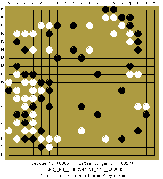 Last move : 1-0 2007 August 3 13:56:22 [Event "FICGS__GO__TOURNAMENT_KYU__000033"] [Site "FICGS"] [Date "2007.05.15"] [Round "1"] [Black "Delque,Michael"] [White "Litzenburger,Xavier"] [Result "1-0"] [Rating 1 "0365"] [Rating 2 "0327"] 1.q17 d4 2.r4 d16 3.p3 r11 4.r14 r7 5.j17 d10 6.f16 k4 7.c14 f17 8.g17 e17 9.c11 c10 10.d11 b16 11.b15 c16 12.j14 n3 13.e10 e9 14.b10 b9 15.c9 d9 16.a9 b8 17.q12 q11 18.k7 q15 19.r15 q16 20.r16 p17 21.q18 o16 22.m6 l17 23.n19 o18 24.o19 n18 25.p18 g3 26.c3 c4 27.d3 e3 28.e2 f2 29.e4 f3 30.b4 b5 31.c5 d5 32.c6 b3 33.b6 a4 34.f10 d6 35.f9 d14 36.e8 d8 37.d7 c8 38.f7 c7 39.m11 f14 40.g13 l14 41.k13 b11 42.b12 a10 43.s6 s7 44.p9 1-0 Here are the names of the openings (joseki) played in the four corners : Corner q16 : q17 r11 Komoku (Somok, Xiao~mu`) 3-4 Point. The komoku (3-4) point is the traditional corner enclosure move.. Corner d16 : d16 j17 Hoshi (Hwajeom, Seongjeom, Xingwei`) 4-4 Point. The star or hoshi (4-4) point, emphasizing influence at the potential expense of territory. Player Black won this Go (weiqi, baduk) game. Follow this game move after move (download)Josekis are not fixed, definitive things. They indicate the moments when everything can change. (Pierre Audouard) The question of whether computers can think is just like question of whether submarines can swim. (Edsger W. Dijkstra)