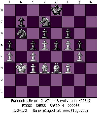 Last move : 1/2-1/2 2018 December 17 23:22:51 [Event "FICGS__CHESS__RAPID_M__000095"] [Site "FICGS"] [Date "2018.07.16"] [Round "1"] [White "Pareschi,Remo"] [Black "Sorbi,Luca"] [Result "1/2-1/2"] [WhiteElo "2107"] [BlackElo "2094"] 1.d4 Nf6 2.c4 e6 3.Nc3 Bb4 4.Bg5 h6 5.Bh4 c5 6.d5 d6 7.e3 Bxc3+ 8.bxc3 e5 9.Nf3 Bf5 10.Nd2 g5 11.Bg3 Qe7 12.h4 Rg8 13.hxg5 hxg5 14.f3 Bg6 15.e4 Nh5 16.Bf2 Nd7 17.Qa4 Kf8 18.g3 Kg7 19.Be2 Rh8 20.Qc2 Nhf6 21.O-O-O Rxh1 22.Rxh1 Rh8 23.Rxh8 Kxh8 24.Qa4 a6 25.Qb3 Nf8 26.g4 Ne8 27.Qb6 Qc7 28.Qxc7 Nxc7 29.Nf1 f6 30.Kb2 Be8 31.Ne3 Bd7 32.Nf5 Bxf5 33.exf5 Na8 34.Kc2 Nb6 35.Kd3 Kg7 36.Kc2 Nfd7 37.Kd3 Kf7 38.Bg3 Na4 39.Be1 Nab6 40.Bf2 Ke7 41.Be3 Na4 42.Kc2 Kd8 43.Kb3 Nab6 44.Bd2 a5 45.a4 Ke8 46.Be1 Nc8 47.Bd2 Ncb6 48.Be3 Nc8 49.Bd3 Ncb6 1/2-1/2 Nimzo-Indian : Leningrad, Main line Queenside Castling by player White (move 21) This chess game ended in a draw. Follow this game move after move (download)If cunning alone were needed to excel, women would be the best Chess players. (Albin) Der Verteidiger gebe der Gewalt nach, aber nur der Gewalt. Er schaffe sich nicht freiwillig, etwa aus Blindheit oder aus Schrecken, irgendwelche Schwächen. Er lasse sich nicht bluffen. (Emanuel Lasker) Solo existe una cosa que Fischer hace en el Ajedrez sin placer: ¡perder!. (Boris Spassky) Il n'y a pas de prix trop élevé au scalp de l'ennemi. (Koblentz) Creativity is allowing yourself to make mistakes. Art is knowing which ones to keep. (Scott Adams)