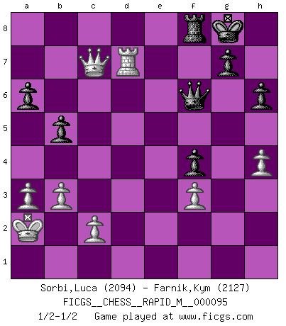 Last move : 1/2-1/2 2018 September 17 9:25:29 [Event "FICGS__CHESS__RAPID_M__000095"] [Site "FICGS"] [Date "2018.07.16"] [Round "1"] [White "Sorbi,Luca"] [Black "Farnik,Kym"] [Result "1/2-1/2"] [WhiteElo "2094"] [BlackElo "2127"] 1.e4 c5 2.Nf3 d6 3.d4 cxd4 4.Nxd4 Nf6 5.Nc3 a6 6.Be3 e5 7.Nb3 Be6 8.f3 Be7 9.Qd2 O-O 10.O-O-O b5 11.g4 Nbd7 12.g5 Nh5 13.Nd5 Bxd5 14.exd5 f5 15.gxf6 Bxf6 16.Na5 Qe8 17.Bh3 Nf4 18.Bxf4 exf4 19.Rhe1 Ne5 20.Re4 Qh5 21.Be6+ Kh8 22.Qe2 Qg6 23.Kb1 Bd8 24.Nb7 Bc7 25.a3 Rf6 26.Nxd6 Bxd6 27.Rxe5 Bxe5 28.Qxe5 h6 29.Qc7 Raf8 30.h4 Qe8 31.b3 Qg6 32.Kb2 Rxe6 33.dxe6 Qxe6 34.Rd7 Qf6+ 35.Ka2 Kg8 1/2-1/2 Sicilian : Najdorf, Byrne (English) attack Kingside Castling by player Black (move 9) Queenside Castling by player White (move 10) This chess game ended in a draw. Follow this game move after move (download)My God, Bobby Fischer plays so simply. (Alexei Suetin) Ich glaube, ich kenne inzwischen die Gründe für mein Versagen: schachliche Charakterfehler. Ich war nie ein Wunderkind und in meiner gesamten menschlichen Entwicklung immer zu langsam. (Viktor Kortschnoi) El Ajedrez es una guerra en un tablero. El objetivo es aplastar la mente del oponente. (Bobby Fischer) Donnez-moi un Cavalier en 6e et je gagnerais toutes mes parties. (Steinitz) It is not true that people stop pursuing dreams because they grow old, they grow old because they stop pursuing dreams. (Gabriel Garcia Marquez)