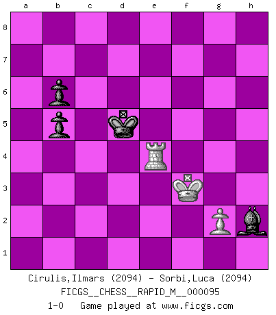 Last move : 1-0 2018 September 29 4:6:29 [Event "FICGS__CHESS__RAPID_M__000095"] [Site "FICGS"] [Date "2018.07.16"] [Round "1"] [White "Cirulis,Ilmars"] [Black "Sorbi,Luca"] [Result "1-0"] [WhiteElo "2094"] [BlackElo "2094"] 1.c4 c5 2.Nc3 Nc6 3.Nf3 Nf6 4.e4 e5 5.a3 Be7 6.Be2 O-O 7.d3 d6 8.Rb1 Ne8 9.b4 b6 10.b5 Nd4 11.Nxd4 cxd4 12.Nd5 Bb7 13.O-O Bxd5 14.cxd5 Nf6 15.f4 Nd7 16.fxe5 dxe5 17.Bg4 Nc5 18.Rf5 Qc7 19.Qf3 Na4 20.Qg3 Nc3 21.Ra1 a6 22.Bd2 axb5 23.Qh3 Rxa3 24.Re1 Nxe4 25.Rxe4 Ra2 26.Be1 Ra1 27.d6 Bxd6 28.Rh5 h6 29.Rxh6 gxh6 30.Qxh6 f5 31.Bxf5 Rxf5 32.Rg4+ Kf7 33.Qg6+ Ke7 34.Qxf5 Rxe1+ 35.Kf2 Qc2+ 36.Kg3 Qxd3+ 37.Qxd3 Re3+ 38.Qxe3 dxe3 39.Re4 Ke6 40.Rxe3 e4 41.Kg4 Bxh2 42.Rxe4+ Kd5 43.Kf3 1-0 English : Symmetrical, Four knights system Kingside Castling by player Black (move 6) Kingside Castling by player White (move 13) 10 pieces endgame at move 38 : White KRPP , Black KBPPPP WHITE : King + 1 Rook 2 Pawns BLACK : King + 1 Bishop 4 Pawns 9 pieces endgame at move 40 : White KRPP , Black KBPPP WHITE : King + 1 Rook 2 Pawns BLACK : King + 1 Bishop 3 Pawns 8 pieces endgame at move 41 : White KRP , Black KBPPP WHITE : King + 1 Rook 1 Pawn BLACK : King + 1 Bishop 3 Pawns 7 pieces endgame at move 42 : White KRP , Black KBPP WHITE : King + 1 Rook 1 Pawn BLACK : King + 1 Bishop 2 Pawns Player White won this chess game. Follow this game move after move (download)In Fischer's hands, a slight theoretical advantage is as good a being a Queen ahead. (Isaac Kashdan) Ich kenne keine einzige Person, die behaupten würde, Garri Kasparow sei ein guter Mensch (Nigel Short) Un Peón pasado aumenta su poder a medida de que el número de piezas en el tablero disminuye. (Capablanca) Il vaut toujours mieux jouer un plan faux de façon logique que de n'avoir pas de plan du tout. (Victor Kortchnoï) It's not the will to win, but the will to prepare to win that makes the difference. (Bear Bryant)