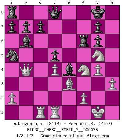 Last move : 1/2-1/2 2018 October 18 15:9:35 [Event "FICGS__CHESS__RAPID_M__000095"] [Site "FICGS"] [Date "2018.07.16"] [Round "1"] [White "Duttagupta,Aniruddha"] [Black "Pareschi,Remo"] [Result "1/2-1/2"] [WhiteElo "2119"] [BlackElo "2107"] 1.e4 e5 2.Nf3 Nc6 3.Bc4 Bc5 4.b4 Bxb4 5.c3 Ba5 6.d4 exd4 7.Qb3 Qf6 8.O-O Nge7 9.cxd4 Bb6 10.e5 Qf5 11.Bd3 Qh5 12.Nc3 O-O 13.Ne2 d5 14.Nf4 Qg4 15.h3 Qd7 16.Be3 Qd8 17.Rfd1 Ng6 18.Ne2 f6 19.Rac1 Be6 20.Bxg6 hxg6 21.Nf4 Na5 22.Qb4 Bf5 23.exf6 Rxf6 24.g4 Be4 25.Ng5 Nc6 26.Qb3 Na5 27.Qb4 1/2-1/2 Evans gambit Kingside Castling by player White (move 8) Kingside Castling by player Black (move 12) This chess game ended in a draw. Follow this game move after move (download)Chess is in its essence a game, in its form an art, and in its execution a science. (Baron Tassilo) Ein Schachspiel besteht aus drei Phasen: Die erste, wenn du hofftst den Vorteil zu haben, die zweite, wenn du glaubst einen Vorteil zu haben, und die dritte.... wenn du weißt Du wirst verlieren. (Savielly Grigorievitsch Tartakower) Solo puedes ser bueno en el Ajedrez si amas al juego. (Bobby Fischer) On croit qu'il y a plus de mauvais joueurs que de bons joueurs, c'est faux : Il y a autant de joueurs qui gagnent que de joueurs qui perdent. (Philippe Geluck) A mistake is only a mistake if you let it happen twice. Otherwise it is a learning experience. (Daniel Parmet)