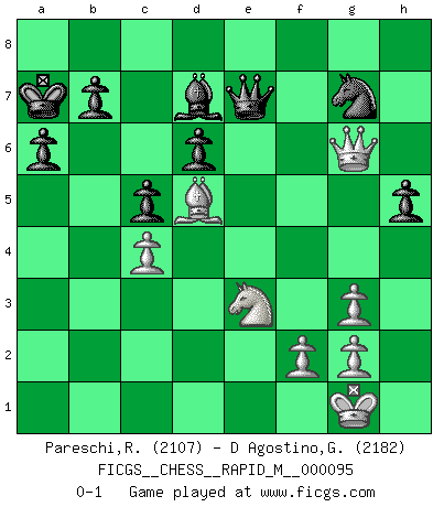 Last move : 0-1 2019 January 27 18:59:57 [Event "FICGS__CHESS__RAPID_M__000095"] [Site "FICGS"] [Date "2018.07.16"] [Round "1"] [White "Pareschi,Remo"] [Black "D Agostino,Gabriele"] [Result "0-1"] [WhiteElo "2107"] [BlackElo "2182"] 1.d4 Nf6 2.c4 e6 3.Nc3 Bb4 4.Bg5 c5 5.d5 h6 6.Bh4 d6 7.e3 Bxc3+ 8.bxc3 Qe7 9.Nf3 Nbd7 10.Bd3 Nb6 11.dxe6 Bxe6 12.Qe2 Bd7 13.Nd2 g5 14.Bg3 Na4 15.O-O Nxc3 16.Qe1 O-O-O 17.e4 Nh5 18.a4 f5 19.Ra3 f4 20.Rxc3 fxg3 21.hxg3 Rhe8 22.Rb3 Bc6 23.e5 Qxe5 24.Qb1 Re7 25.Bf5+ Kb8 26.Re3 Qg7 27.Rxe7 Qxe7 28.Re1 Qc7 29.Be4 Bxa4 30.Bf3 g4 31.Bxg4 Nf6 32.Bf3 Re8 33.Rxe8+ Nxe8 34.Qg6 Qg7 35.Qb1 Nf6 36.Nf1 Be8 37.Ne3 Bg6 38.Qb2 Ne8 39.Qb3 Nf6 40.Qb2 h5 41.Nd5 Ne8 42.Qc1 Bf7 43.Qe1 Qg5 44.Ne3 Qe7 45.Qd1 Ng7 46.Qb1 Be6 47.Qg6 a6 48.Bd5 Bc8 49.Bf3 Ka7 50.Bd5 Bd7 0-1 This chess game has been lost on time (started : 2018.07.16 17:27:14) Nimzo-Indian : Leningrad variation Kingside Castling by player White (move 15) Queenside Castling by player Black (move 16) Player Black won this chess game. Follow this game move after move (download)Excellence at Chess is one mark of a scheming mind. (Sir Arthur Conan Doyle) Ich würde mich als ganz normalen Jungen bezeichnen [Im Alter von 12]. (Sergej Karjakin) Si un gobernante no entiende al Ajedrez, ¿como puede governar él un reinado?. (El Rey Khusros II) J'apprécie les joueurs d'est-indienne, c'est grâce à eux que je nourris ma famille depuis tant d'années. (Petrosian) I'll be back. (Arnold Schwarzenegger)