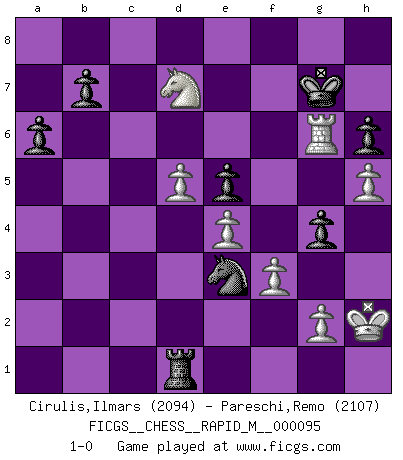Last move : 1-0 2018 December 31 15:43:53 [Event "FICGS__CHESS__RAPID_M__000095"] [Site "FICGS"] [Date "2018.07.16"] [Round "1"] [White "Cirulis,Ilmars"] [Black "Pareschi,Remo"] [Result "1-0"] [WhiteElo "2094"] [BlackElo "2107"] 1.b4 Nf6 2.c4 g6 3.Nf3 d5 4.e3 Bg7 5.d4 Bf5 6.Nbd2 c6 7.a4 Nbd7 8.Be2 dxc4 9.Nxc4 O-O 10.O-O Nb6 11.Nce5 Ne4 12.Qb3 Qd5 13.Qb2 Nd6 14.Nd2 f6 15.Nef3 Qf7 16.Bd1 Rad8 17.b5 cxb5 18.axb5 Bd3 19.Re1 Nxb5 20.e4 Bh6 21.Qb4 Bxd2 22.Bxd2 a6 23.Bh6 Rfe8 24.Rc1 g5 25.Bb3 e6 26.Rcd1 Bc4 27.Bxc4 Nxc4 28.Qxc4 Qg6 29.Bxg5 fxg5 30.h3 h6 31.Rd3 Qg7 32.d5 Nd6 33.Qb3 e5 34.Nd2 Qg6 35.Qb6 Rc8 36.Nf1 Kh7 37.Rf3 Rf8 38.Ng3 Rfe8 39.Rb1 Re7 40.Nh5 Nc4 41.Qb4 Qd6 42.Qa4 Nd2 43.Rf6 Qc7 44.Rd1 Qc2 45.Qxc2 Rxc2 46.Rb6 Rec7 47.Nf6+ Kh8 48.h4 Rc1 49.Rxc1 Rxc1+ 50.Kh2 Kg7 51.h5 Rd1 52.f3 Nc4 53.Re6 Ne3 54.Nd7 g4 55.Rg6+ 1-0 This chess game has been lost on time (started : 2018.07.16 17:27:14) Polish (Sokolsky) opening Kingside Castling by player Black (move 9) Kingside Castling by player White (move 10) Player White won this chess game. Follow this game move after move (download)Let the perfectionist play postal. (Yasser Seirawan) Weshalb minderdergeübte Spieler mit g2-g4 beginnen? Die betreffenden sind unschlüssig, ob sie nun rechts (h4) oder links (f4) beginnen sollen, und in ihrer Ratlosigkeit entschliessen sie sich nach guter Bürgerart dazu, den goldenen Mittelweg zu wählen. (Aaron Nimzowitsch) Hay dos clases de hombres: aquellos que se conforman en dejarse llevar por las circunstancias y que juegan barajas y aquellos decididos a controlar las circunstancias y que juegan al Ajedrez. (Mortimer Collins) Aidez vos pièces, elles vous aideront. (Paul Morphy) Unless I accept my faults I will most certainly doubt my virtues. (Hugh Prather)