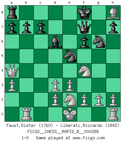 Last move : 1-0 2018 August 10 12:49:58 [Event "FICGS__CHESS__RAPID_B__000288"] [Site "FICGS"] [Date "2018.07.18"] [Round "1"] [White "Faust,Dieter"] [Black "Liberati,Riccardo"] [Result "1-0"] [WhiteElo "1760"] [BlackElo "1842"] 1.b4 e5 2.Bb2 Bxb4 3.Bxe5 Nc6 4.Bxg7 d5 5.Bxh8 Qe7 6.e3 Bf5 7.Bd3 Bxd3 8.cxd3 f6 9.a3 Bd6 10.Nc3 Ne5 11.Nxd5 Qf7 12.Qa4+ Kf8 13.Nf4 Ne7 14.Rb1 N7g6 15.Nge2 1-0 Polish (Sokolsky) opening Player White won this chess game. Follow this game move after move (download)Chess is a fighting game which is purely intellectual and includes chance. (Richard Reti) Ich möchte Schüler heranbilden, die das Vermögen haben, selbst zu denken und Kritik zu üben. (Emanuel Lasker) El Rey es una pieza de pelea. ¡Usenlo!. (Wilhelm Steinitz) Un footballeur joue avec ses pieds, parfois avec sa tête. Un joueur d'échecs ne joue qu'avec sa tête. Et quand il ne joue plus, il meurt. (Jacob Murray) First of all, we have to go back to the classical time control. (Anatoly Karpov)