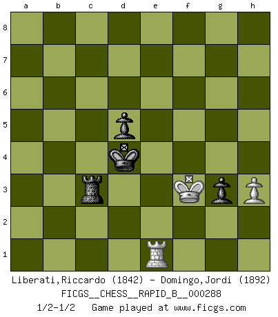 Last move : 1/2-1/2 2019 February 6 10:53:27 [Event "FICGS__CHESS__RAPID_B__000288"] [Site "FICGS"] [Date "2018.07.18"] [Round "1"] [White "Liberati,Riccardo"] [Black "Domingo,Jordi"] [Result "1/2-1/2"] [WhiteElo "1842"] [BlackElo "1892"] 1.e4 e5 2.Nf3 d6 3.Nc3 Nf6 4.Be2 Be7 5.d4 Nbd7 6.a4 O-O 7.O-O c6 8.Re1 a5 9.h3 Qc7 10.Be3 Re8 11.Qd2 Bf8 12.Bc4 exd4 13.Nxd4 Nxe4 14.Nxe4 Rxe4 15.Bd3 Re8 16.Bf4 Rxe1+ 17.Rxe1 Ne5 18.c4 Bd7 19.b3 Nxd3 20.Qxd3 Qd8 21.Rd1 Qf6 22.Be3 Re8 23.Qd2 h6 24.Ne2 Qd8 25.Qd3 Bc8 26.Qc2 b6 27.Nf4 Qc7 28.Qc3 Bf5 29.Nh5 Bg6 30.Nf4 Be4 31.Nh5 f6 32.Nf4 Qb7 33.f3 Bh7 34.Bf2 Qc7 35.g3 Qd8 36.Re1 Re5 37.g4 Be7 38.Rd1 g5 39.Nh5 Bg6 40.f4 Re4 41.fxg5 hxg5 42.Ng3 Re5 43.Bd4 Re6 44.Nf5 Bxf5 45.gxf5 Re4 46.Bf2 Qd7 47.Qf3 Rf4 48.Qd3 Qxf5 49.Qxf5 Rxf5 50.Bxb6 Kf7 51.Rd3 Ke8 52.Kg2 Re5 53.Rf3 Kd7 54.Kf2 f5 55.Bd4 f4 56.Bc3 Ke6 57.Rd3 Rf5 58.Kf3 Bd8 59.b4 Bb6 60.Rd1 Be3 61.b5 Rc5 62.Bxa5 Rxc4 63.Bd8 d5 64.Bxg5 Ke5 65.Bh4 Rxa4 66.bxc6 Rc4 67.Rd3 Rxc6 68.Bg3 fxg3 69.Rxe3+ Kd4 70.Re1 Rc3+ 1/2-1/2 Philidor's defense Kingside Castling by player Black (move 6) Kingside Castling by player White (move 7) 10 pieces endgame at move 66 : White KRBPP , Black KRBPP WHITE : King + 1 Rook 1 Bishop 2 Pawns BLACK : King + 1 Rook 1 Bishop 2 Pawns 9 pieces endgame at move 67 : White KRBP , Black KRBPP WHITE : King + 1 Rook 1 Bishop 1 Pawn BLACK : King + 1 Rook 1 Bishop 2 Pawns 8 pieces endgame at move 68 : White KRP , Black KRBPP WHITE : King + 1 Rook 1 Pawn BLACK : King + 1 Rook 1 Bishop 2 Pawns 7 pieces endgame at move 69 : White KRP , Black KRPP WHITE : King + 1 Rook 1 Pawn BLACK : King + 1 Rook 2 Pawns This chess game ended in a draw. Follow this game move after move (download)We don't really know how the game was invented, though there are suspicions. As soon as we discover the culprits, we'll let you know. (Bruce Pandolfini) Bobby Fischer ist kein Vorbild für die heutige Jugend. (Viktor Kortschnoi) Fischer no está bajo la obligación de nadie. (Joseph Platz) Botvinnik disait en comparant les échecs à la musique: Il existe une science dont le but est l'étude de l'acoustique et des sons. Mais il y a aussi un art qui se sert de l'océan des sons : c'est la musique. De toute évidence, il en est de même pour la pensée. La logique est l'étude des lois de la réflexion et les échecs reflètent, en tant qu'art, le côté logique de la réflexion, sous la forme d'images artistiques... Extrait de Fischer - Spassky, Reykjavik 1972 par Alexander & F. Wyndham (Ed. Solar), p 37. There are three kinds of lies: lies, damned lies and statistics. (Mark Twain)