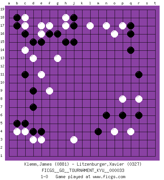 Last move : 1-0 2007 July 18 23:38:9 [Event "FICGS__GO__TOURNAMENT_KYU__000033"] [Site "FICGS"] [Date "2007.05.15"] [Round "1"] [Black "Klemm,James"] [White "Litzenburger,Xavier"] [Result "1-0"] [Rating 1 "0881"] [Rating 2 "0327"] 1.q16 q4 2.c16 c4 3.j17 j3 4.d7 o16 5.q14 l17 6.j15 p17 7.q17 n17 8.r6 r8 9.p6 o4 10.e4 e3 11.d4 d3 12.c5 b4 13.b5 c14 14.c11 e17 15.d15 d13 16.f16 e16 17.e15 f17 18.g16 c18 19.b18 c17 20.b17 h18 21.j18 h17 22.h15 g13 23.r11 p8 24.n6 e11 25.d9 f9 26.m4 1-0 This go game has been lost on time (started : 2007.05.15 19:42:59) Here are the names of the openings (joseki) played in the four corners : Corner q16 : q16 o16 Hoshi (Hwajeom, Seongjeom, Xingwei`) 4-4 Point. The star or hoshi (4-4) point, emphasizing influence at the potential expense of territory. Ikken Takagakari (Hankan Nop'dakeolch'im, Yi Gaojia, 1-Space High Approach). Black typically responds at 6-4 or 3-10. Black 4-10 is played when Black finds play on the right side advantageous. Black 4-8 or 3-8 may be played when Black has support at top. Corner q4 : q4 r6 Hoshi (Hwajeom, Seongjeom, Xingwei`) 4-4 Point. The star or hoshi (4-4) point, emphasizing influence at the potential expense of territory. Ikken Kakari (Hankan Keolch'im, Yi Gua`jiao~, 1-Space Low Approach). Black 2 is the standard approach move to the 4-4. Player Black won this Go (weiqi, baduk) game. Follow this game move after move (download)If you have won four corners, resign. (Anonymous) Those who make the worst use of their time are the first to complain of its brevity. (Jean de la Bruyere)