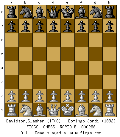 Last move : 0-1 2018 August 17 22:46:54 [Event "FICGS__CHESS__RAPID_B__000288"] [Site "FICGS"] [Date "2018.07.18"] [Round "1"] [White "Davidson,Slasher"] [Black "Domingo,Jordi"] [Result "0-1"] [WhiteElo "1700"] [BlackElo "1892"] 0-1 This chess game has been lost on time (started : 2018.07.18 14:55:56) Player Black won this chess game. Follow this game move after move (download)Good offense and good defense both begin with good development. (Bruce A. Moon) Besser ein falscher Plan, logisch durchgeführt, als gar kein Plan. (Viktor Kortschnoi) Un juego de Ajedrez es un dialogo, una conversación entre un jugador y su oponente. Cada movimiento del oponente puede contener amenazas o tropiezos, pero un jugador no se puede defender de las amenazas o tomar ventaja de los tropiezos si es que no se pregunta a sí mismo: ¿Que es lo que mi oponente va a hacer después de cada movida?. (Bruce A. Moon) On est toujours la mazette de quelqu'un d'autre. (Anonyme) Wipe them out. All of them. (Darth Sidious in Star Wars ep.1)