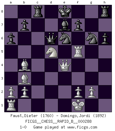 Last move : 1-0 2018 October 9 18:41:55 [Event "FICGS__CHESS__RAPID_B__000288"] [Site "FICGS"] [Date "2018.07.18"] [Round "1"] [White "Faust,Dieter"] [Black "Domingo,Jordi"] [Result "1-0"] [WhiteElo "1760"] [BlackElo "1892"] 1.Nf3 h6 2.e4 c5 3.c3 g5 4.d4 cxd4 5.cxd4 Nf6 6.Nc3 d6 7.e5 dxe5 8.Nxe5 Bg7 9.h4 gxh4 10.Rxh4 Nc6 11.Bb5 Bd7 12.Nxd7 Nxd7 13.Kf1 a6 14.Qg4 Bf8 15.Ba4 Rc8 16.Qf3 e6 17.Rf4 Be7 18.d5 exd5 19.Nxd5 Nde5 20.Qe4 Qd6 21.Rf5 Ng6 22.Bb3 Nd8 23.Bd2 Ne6 24.Bb4 1-0 Reti Opening Player White won this chess game. Follow this game move after move (download)First-class players lose to second class players because second-class players sometimes play a first-class game. (Tarrasch) Frage: Wie viele Autos haben Sie schon zerstört? - Antwort: Nur zwei. (Loek van Wely) Un entendimiento minucioso de las típicas continuaciones de mate hacen de las mas complicadas combinaciones de sacrificio que conducen hacia ellas no solo no dificiles, sino casi un asunto de rutina. (Siegbert Tarrasch) Les Echecs sont affaire de jugement sensible. Savoir quand frapper et quand esquiver. (Fischer) My poor ole parrot... Is not in the circulation of displays ....poo hoo hoo :) (Wayne Lowrance's enigma)