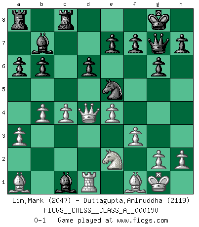 Last move : 0-1 2019 March 5 10:13:36 [Event "FICGS__CHESS__CLASS_A__000190"] [Site "FICGS"] [Date "2018.07.20"] [Round "1"] [White "Lim,Mark"] [Black "Duttagupta,Aniruddha"] [Result "0-1"] [WhiteElo "2047"] [BlackElo "2119"] 1.d4 Nf6 2.Nf3 c5 3.e3 g6 4.Be2 Bg7 5.O-O O-O 6.dxc5 Na6 7.c4 Nxc5 8.b4 Nce4 9.Bb2 b6 10.Nbd2 Bb7 11.Nxe4 Bxe4 12.Nd4 d6 13.f3 Bb7 14.e4 a6 15.Qd2 Qc7 16.Rac1 Nd7 17.Rfd1 Rfc8 18.a3 Qd8 19.Bf1 Qf8 20.Ne2 Bh6 21.Qc3 Ne5 22.Qd4 Qg7 23.Ba1 Bxc1 0-1 This chess game has been lost on time (started : 2018.07.20 16:21:9) Queen's pawn game Kingside Castling by player White (move 5) Kingside Castling by player Black (move 5) Player Black won this chess game. Follow this game move after move (download)Becoming successful at Chess allows you to discover your own personality. That's what I want for the kids I teach. (Saudin Robovic) Kombinieren und Schwarzhandel gehören verboten. (Savielly Grigorievitsch Tartakower) Las piezas de Ajedrez son los bloques del alfabeto que moldean los pensamientos; y esos pensamientos, aunque hagan un diseño visual en el tablero, expresan abstractamente su belleza como un poema. (Marcel Duchamp) Même si l'adversaire joue le coup analysé précédemment, recommencez l'analyse en voyant la nouvelle position. Première règle de Blumenfeld There are three kinds of lies: lies, damned lies and statistics. (Mark Twain)