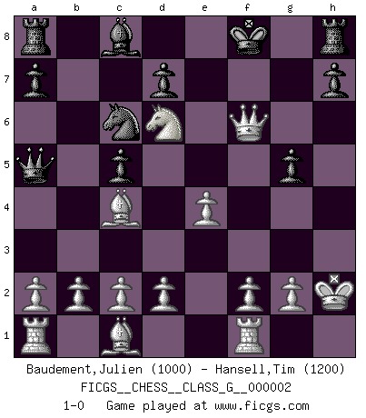Last move : 1-0 2006 July 3 4:45:53 [Event "FICGS__CHESS__CLASS_G__000002"] [Site "FICGS"] [Date "2006.06.07"] [Round "1"] [White "Baudement,Julien"] [Black "Hansell,Tim"] [Result "1-0"] [WhiteElo "1000"] [BlackElo "1200"] 1.e4 c5 2.Nf3 e5 3.Nxe5 Bd6 4.Nxf7 Kxf7 5.Bc4+ Kf8 6.Qf3+ Nf6 7.Nc3 b6 8.O-O b5 9.Nxb5 Bxh2+ 10.Kxh2 Qa5 11.Nd6 Nc6 12.Qf4 g5 13.Qxf6+ 1-0 Sicilian defense Kingside Castling by player White (move 8) Player White won this chess game. Follow this game move after move (download)I believe that Chess possesses a magic that is also a help in advanced age. A rheumatic knee is forgotten during a game of Chess and other events can seem quite unimportant in comparison with a catastrophe on the chessboard. (Vlastimil Hort) Ich bewundere Kasparows phantasievolle Angriffssiege aus den Achtzigern und Neunzigern, aber wenn man sie mit dem Computer überprüft, nimmt der Computer in jeder zweiten Partie die Opfer an, verteidigt sich und gewinnt. (Vladimir Kramnik) Repentinamente, me resultaba obvio en mi analisis que yo había pasado por alto lo que Fischer había visto en el tablero con la mas grande facilidad. (Mikhail Botvinnik) Les Echecs sont affaire de jugement sensible. Savoir quand frapper et quand esquiver. (Fischer) Drag your thoughts away from your troubles... by the ears, by the heels, or any other way you can manage it. (Mark Twain)