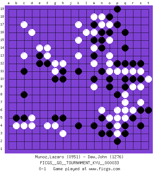 Last move : 0-1 2007 October 16 6:50:19 [Event "FICGS__GO__TOURNAMENT_KYU__000033"] [Site "FICGS"] [Date "2007.05.15"] [Round "1"] [Black "Munoz,Lazaro"] [White "Dew,John"] [Result "0-1"] [Rating 1 "0951"] [Rating 2 "1276"] 1.q16 d4 2.q4 d16 3.q10 o17 4.m17 o15 5.q14 o13 6.p12 k17 7.m15 k15 8.m13 k13 9.n11 m14 10.n14 m16 11.n16 l16 12.n15 n17 13.o16 c17 14.k4 r6 15.r5 q6 16.o4 r9 17.p17 m18 18.q9 q8 19.r10 s9 20.c11 c13 21.c8 h3 22.b5 b4 23.c5 c4 24.s6 s7 25.t6 d5 26.e12 p3 27.q3 q5 28.s4 p4 29.p5 o5 30.o3 p6 31.p2 p5 32.o18 n18 33.p19 s11 34.s10 t10 35.s12 r11 36.r12 q11 37.o9 p11 38.o10 o12 39.p8 q7 40.q12 o11 41.n5 n4 42.n3 n6 43.m4 m9 44.m10 m12 45.k11 h12 46.h11 g11 47.h10 f13 48.e13 e14 49.h5 g4 50.g5 f4 51.g10 g12 52.f12 f14 0-1 This go game has been lost on time (started : 2007.05.15 19:42:59) Here are the names of the openings (joseki) played in the four corners : Corner q16 : q16 o17 Hoshi (Hwajeom, Seongjeom, Xingwei`) 4-4 Point. The star or hoshi (4-4) point, emphasizing influence at the potential expense of territory. Ikken Kakari (Hankan Keolch'im, Yi Gua`jiao~, 1-Space Low Approach). White 2 is the standard approach move to the 4-4. Corner q4 : q4 r6 Hoshi (Hwajeom, Seongjeom, Xingwei`) 4-4 Point. The star or hoshi (4-4) point, emphasizing influence at the potential expense of territory. Ikken Kakari (Hankan Keolch'im, Yi Gua`jiao~, 1-Space Low Approach). White 2 is the standard approach move to the 4-4. Corner d4 : d4 c8 Hoshi (Hwajeom, Seongjeom, Xingwei`) 4-4 Point. The star or hoshi (4-4) point, emphasizing influence at the potential expense of territory. Player White won this Go (weiqi, baduk) game. Follow this game move after move (download)In the opening, when you don't know what to play, make a shimari. (Jansteen) Hold em is to stud what chess is to checkers. (Johnny Moss)