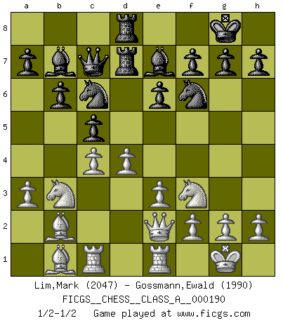 Last move : 1/2-1/2 2018 August 19 15:9:21 [Event "FICGS__CHESS__CLASS_A__000190"] [Site "FICGS"] [Date "2018.07.20"] [Round "1"] [White "Lim,Mark"] [Black "Gossmann,Ewald"] [Result "1/2-1/2"] [WhiteElo "2047"] [BlackElo "1990"] 1.d4 Nf6 2.Nf3 e6 3.c4 b6 4.e3 Bb7 5.Bd3 d5 6.b3 dxc4 7.bxc4 c5 8.O-O Be7 9.Bb2 Nc6 10.Re1 O-O 11.Nbd2 Rc8 12.Rc1 Rc7 13.Qe2 Rd7 14.Bb1 Qc7 15.a3 Rfd8 16.Nb3 1/2-1/2 Queen's pawn game Kingside Castling by player White (move 8) Kingside Castling by player Black (move 10) This chess game ended in a draw. Follow this game move after move (download)Not all artists are Chess players, but all Chess players are artists. (Marcel Duchamp) Wenn es im Universum noch irgendwo intelligente Lebewesen gibt, dann kennen sie Go. (Emanuel Lasker) Un entendimiento a fondo de las continuaciones típicas del mate, hace de las combinaciones de sacrificio mas complicadas conducirlas a ellas no solo sin dificultad, sino casi de una manera natural. (Siegbert Tarrasch) On est toujours la mazette de quelqu'un d'autre. (Anonyme) Fear is the path to the dark side. Fear leads to anger; anger leads to hate; hate leads to suffering. I sense much fear in you. (Master Yoda in Star Wars ep.1)