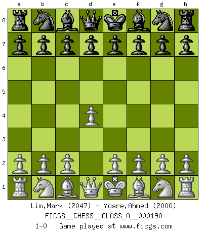 Last move : 1-0 2018 August 29 23:10:43 [Event "FICGS__CHESS__CLASS_A__000190"] [Site "FICGS"] [Date "2018.07.20"] [Round "1"] [White "Lim,Mark"] [Black "Yosre,Ahmed"] [Result "1-0"] [WhiteElo "2047"] [BlackElo "2000"] 1.d4 1-0 This chess game has been lost on time (started : 2018.07.20 16:21:9) Queen's pawn Player White won this chess game. Follow this game move after move (download)The Chess pieces are the block alphabet which shapes thoughts; and these thoughts, although making a visual design on the chessboard, express their beauty abstractly, like a poem. (Marcel Duchamp) In Buenos Aires ist es nicht mein vorrangiges Ziel ein starkes Turnier zu organisieren, sondern ein Turnier für Gentlemen. Ich würde nie Kamsky einladen. Ich mag keine Probleme. (Miguel Najdorf) Las piezas de Ajedrez son los bloques del alfabeto que moldean los pensamientos; y esos pensamientos, aunque hagan un diseño visual en el tablero, expresan abstractamente su belleza como un poema. (Marcel Duchamp) Les échecs, c'est la lutte contre l'erreur. (Johannes Zukertort) Life is verb, not a noun. (Charlotte Perkins Gilman)