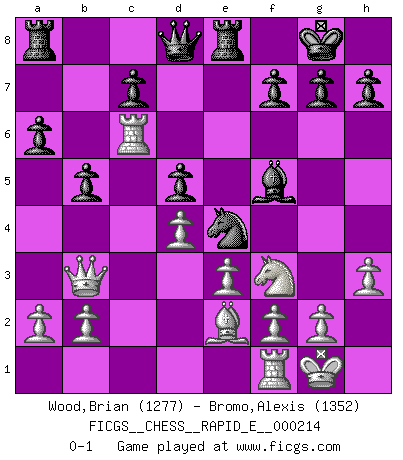 Last move : 0-1 2018 September 18 1:28:35 [Event "FICGS__CHESS__RAPID_E__000214"] [Site "FICGS"] [Date "2018.07.21"] [Round "1"] [White "Wood,Brian"] [Black "Bromo,Alexis"] [Result "0-1"] [WhiteElo "1277"] [BlackElo "1352"] 1.Nf3 d5 2.c4 e6 3.d4 Bb4+ 4.Bd2 Bxd2+ 5.Nbxd2 Nf6 6.e3 a6 7.Rc1 O-O 8.cxd5 exd5 9.h3 Nc6 10.Be2 Re8 11.O-O Ne7 12.Ne5 Be6 13.Qb3 b5 14.Nc6 Nxc6 15.Rxc6 Bf5 16.Nf3 Ne4 0-1 This chess game has been lost on time (started : 2018.07.21 17:3:26) Reti Opening Kingside Castling by player Black (move 7) Kingside Castling by player White (move 11) Player Black won this chess game. Follow this game move after move (download)You may learn much more from a game you lose than from a game you win. You will have to lose hundreds of games before becoming a good player. (Jose Raul Capablanca) In der Schule lernt man nichts. Es ist nur Zeitverschwendung. (Robert James Fischer) Combinaciones deslumbrantes son para la mayoría, mover madera es para los pocos. (Georg Kieninger) Toutes choses étant égales, c'est la conviction qui gagne. Alliée à une volonté de vaincre, elle sert de détonateur, suscite des idées, disperse les doutes et aide à penser clairement. (Robert Fischer) The Internet is the world's largest library. It's just that all the books are on the floor. (John Allen Paulos)